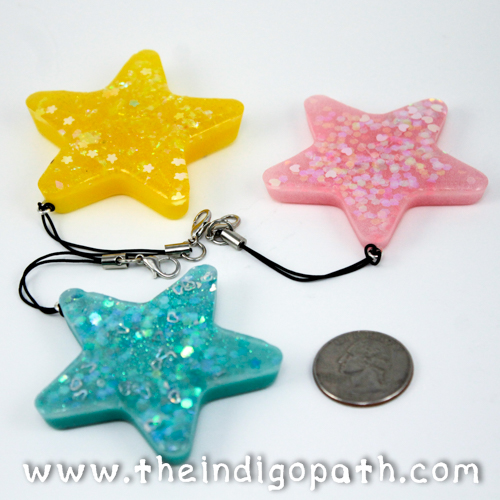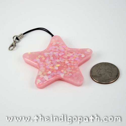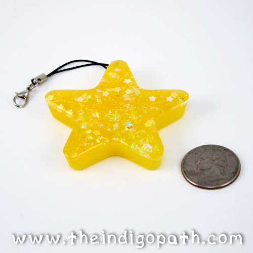 This large pendant features a glittery resin star in pink, blue, or yellow. Comes with an 18in silver chain and a keychain adapter so you can wear it any way you like.
