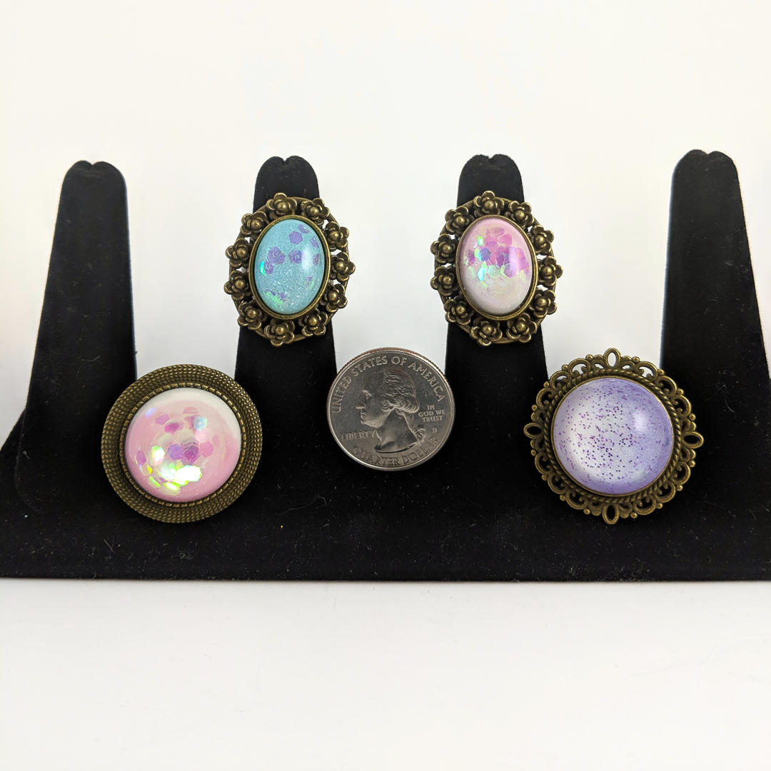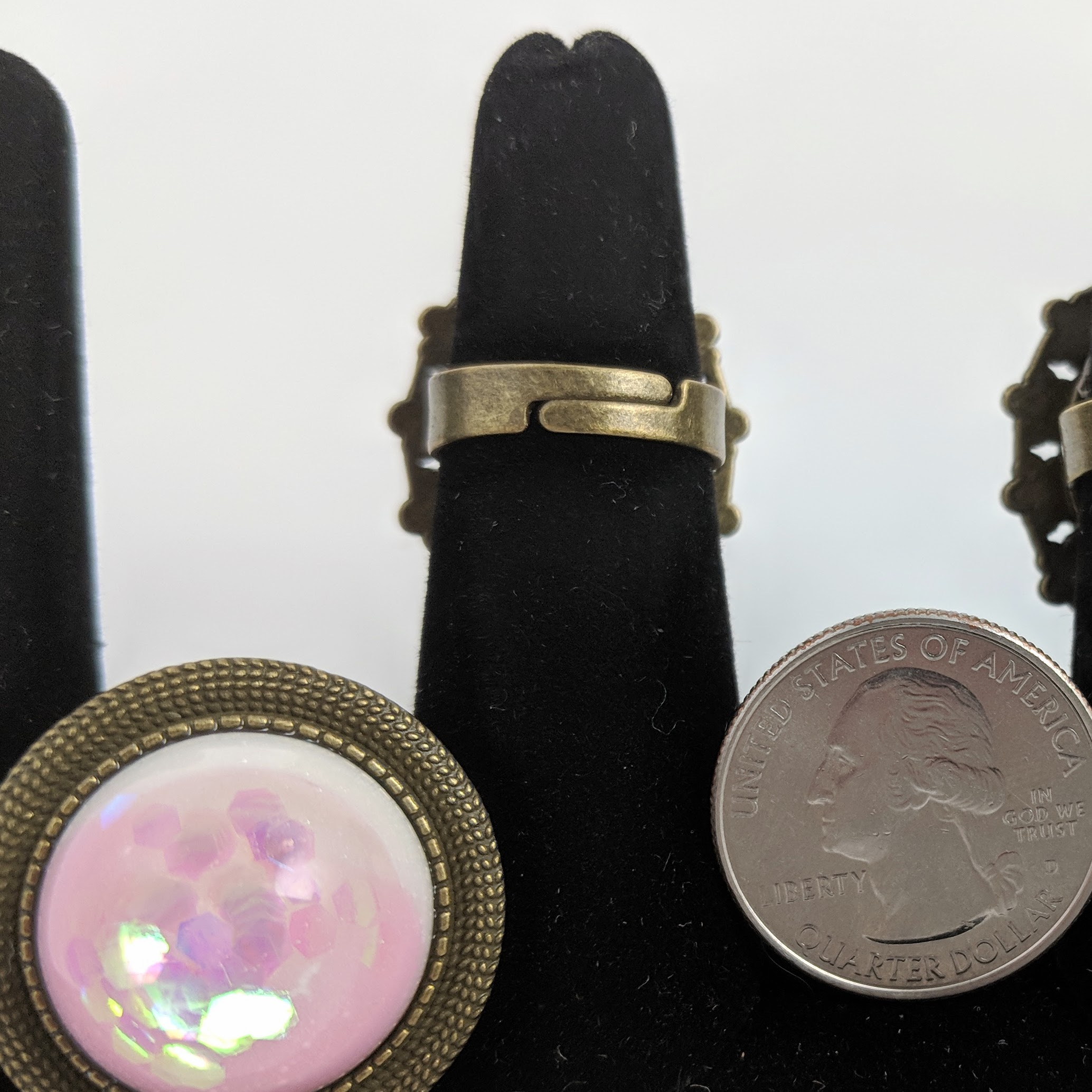 These classy rings make great accessories for steampunk, lolita, or cosplay outfits. Rings are adjustable and come on an "antique gold" base. Pick a color, and the design is a surprise!