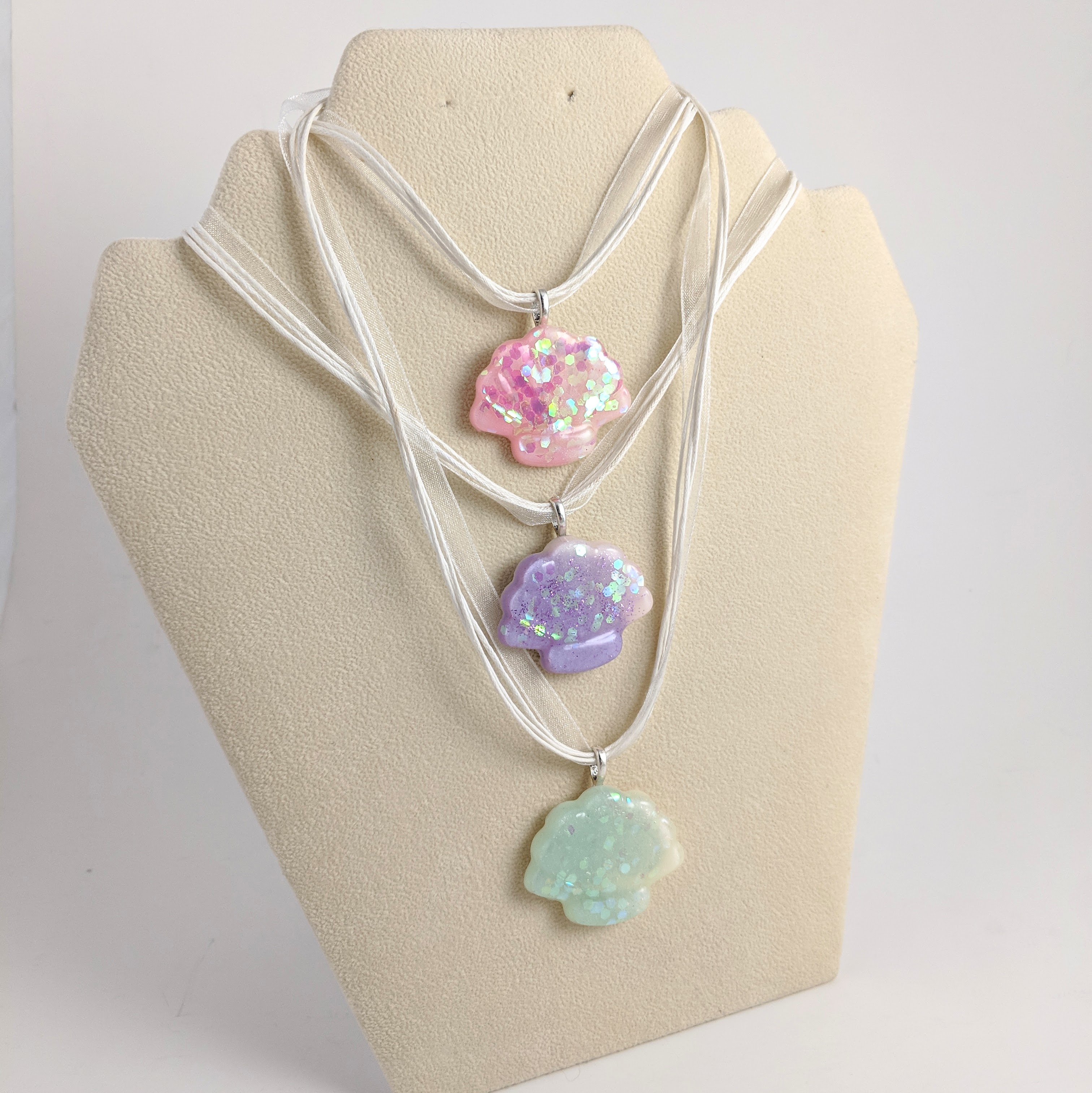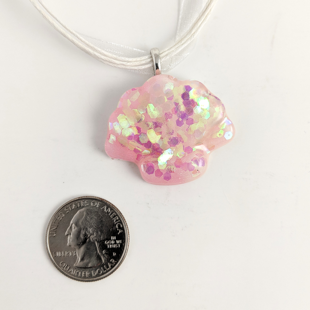 Bring the ocean to you with this glittery clam shell necklace made with high gloss resin. It shimmers like the sea. A perfect way to finish your marine-themed look.