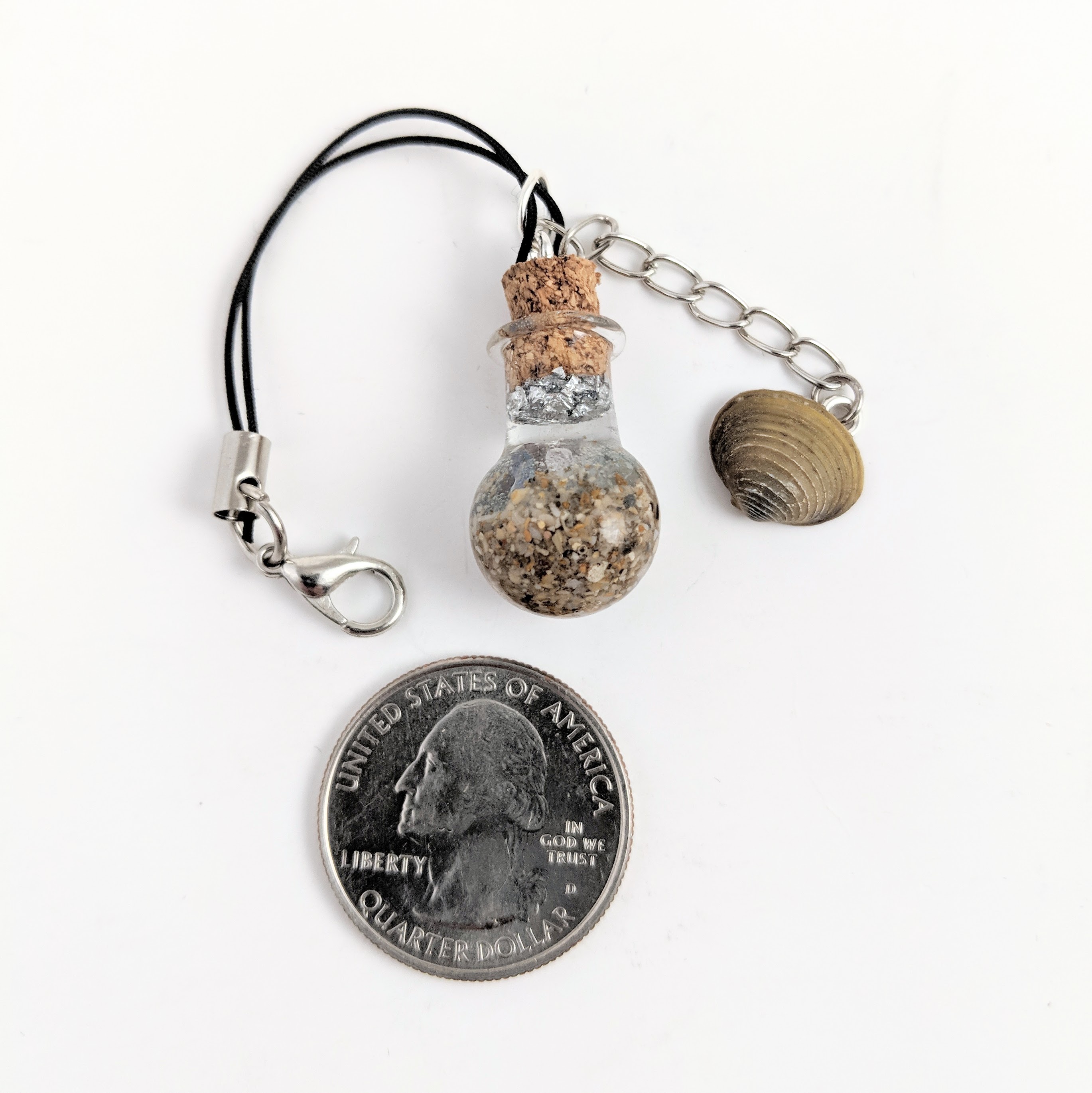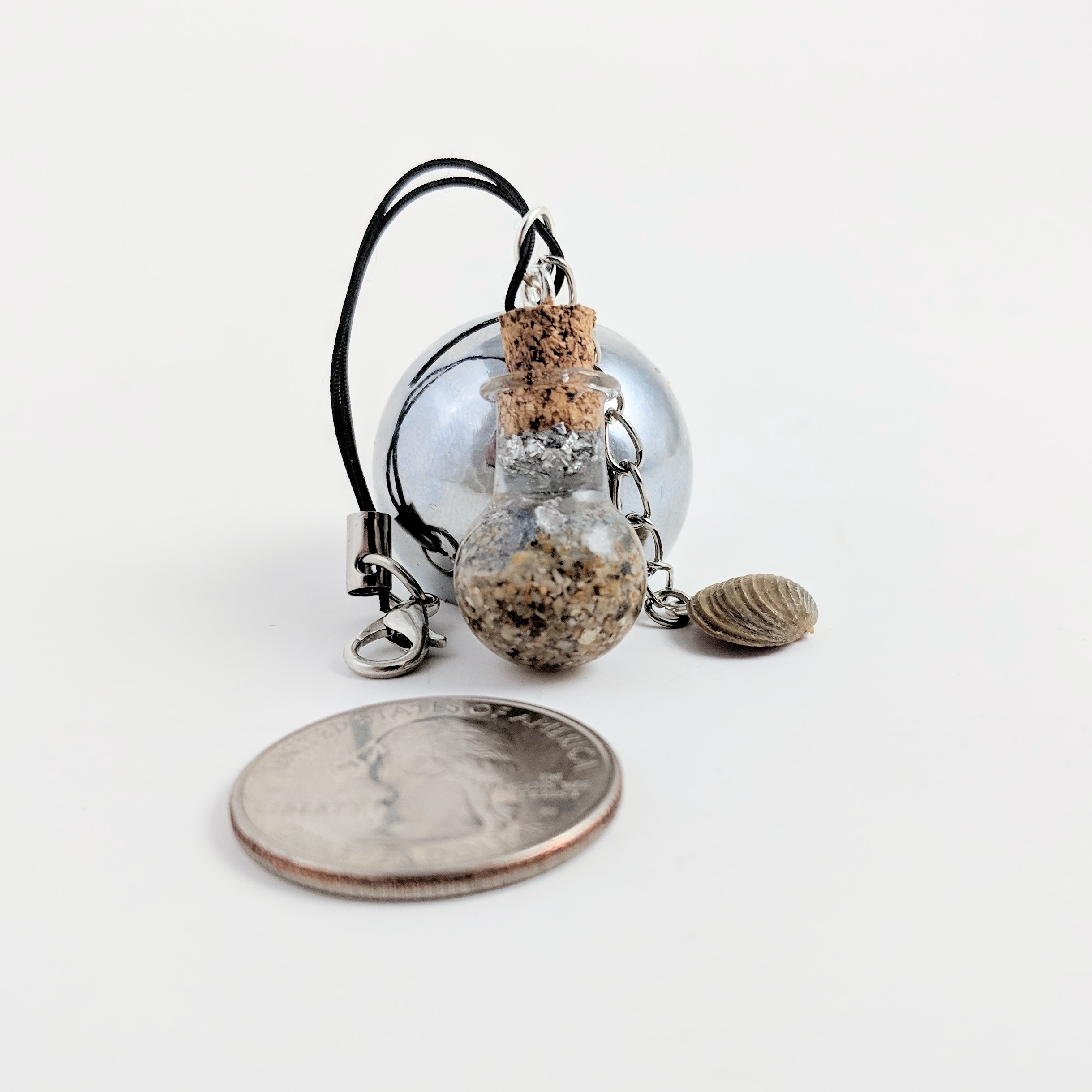 Real gems and beach sand. This jar comes on a black keychain cord.